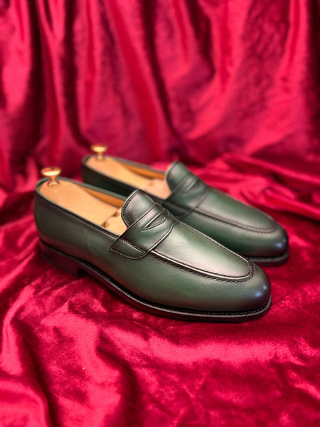 Introducing the Manchester Penny Loafer in Bottle Green, a stylish and sophisticated footwear option. This exquisite loafer features a vibrant green color that adds a touch of elegance to any outfit. Crafted with meticulous attention to detail, the loafer is designed to provide both comfort and style. Its sleek silhouette and classic penny strap make it a timeless choice for any occasion. The loafer is showcased on a luxurious red velvet surface, further enhancing its opulent appeal. Whether you're attending a formal event or simply looking to elevate your everyday attire, the Manchester Penny Loafer in Bottle Green is the perfect choice for the discerning individual.