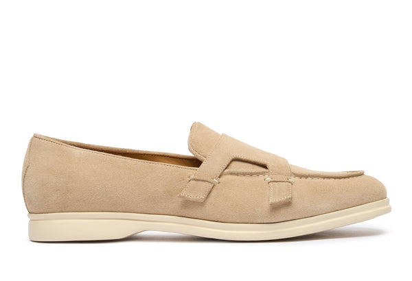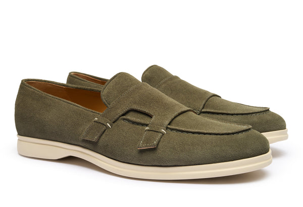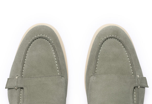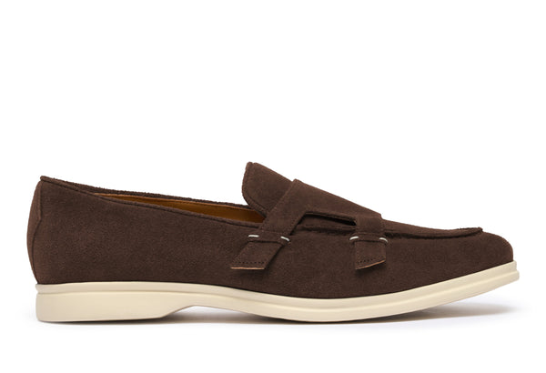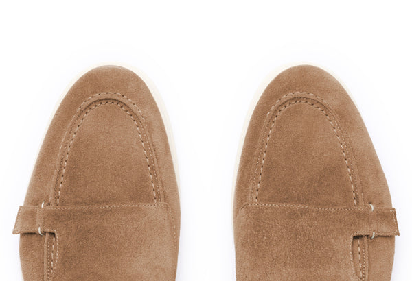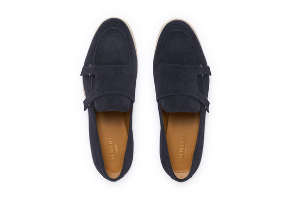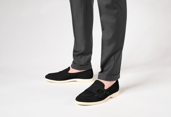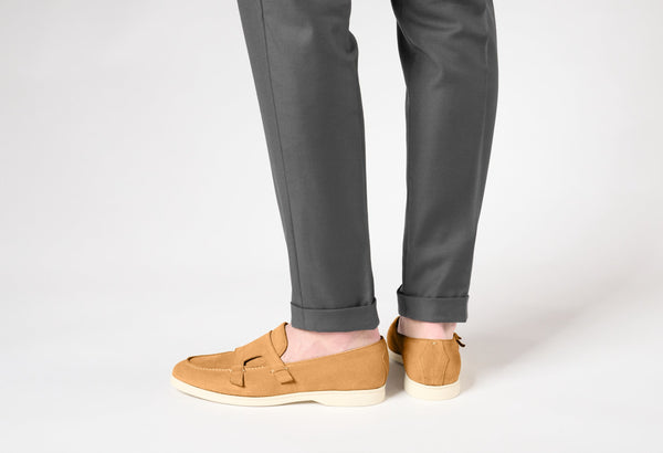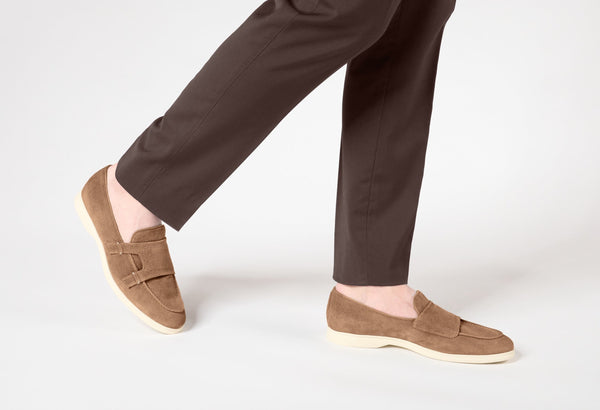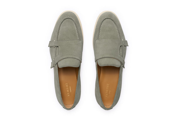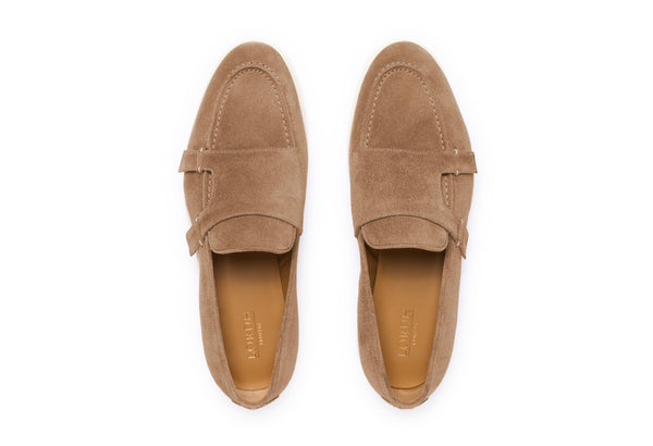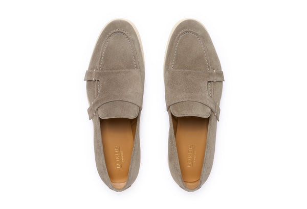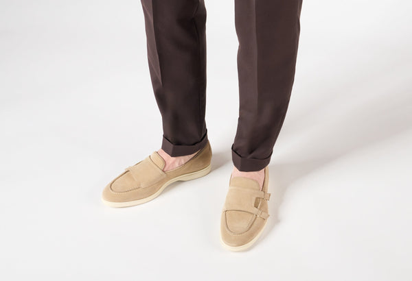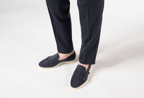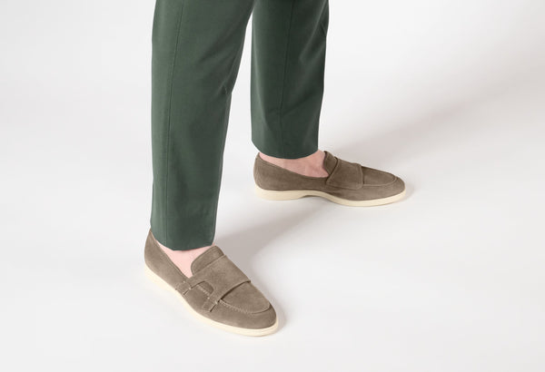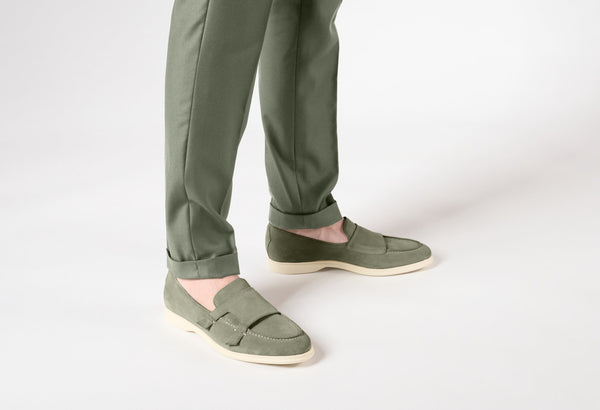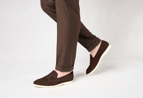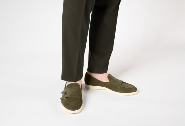 Immagina la sensazione della morbida pelle scamosciata che avvolge delicatamente il tuo piede. I doppi cinturini laterali in suede con le cuciture fatte a mano, un dettaglio di design che non passa inosservato, aggiunge un tocco di modernità e individualità. Questi non sono semplici mocassini: sono una dichiarazione di stile, un invito a distinguerti con classe.