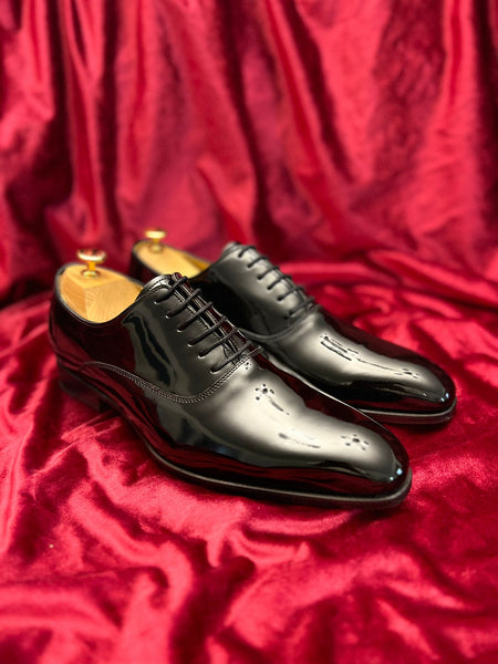 Introducing our Oxford Tuxedo Shoes in Black Patent, the epitome of elegance and sophistication. Crafted with meticulous attention to detail, these dress shoes are designed to make a lasting impression. The sleek black patent leather exudes a timeless charm, while the classic Oxford style adds a touch of refinement. Resting on a vibrant red cloth, these shoes create a striking contrast that enhances their allure. Perfect for formal occasions or adding a touch of class to any ensemble, our black dress shoes are a must-have for the discerning gentleman.
