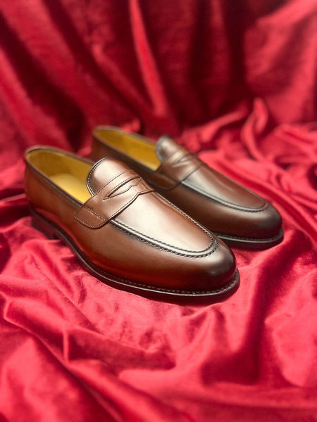 Introducing the Manchester Penny Loafer Chocolate Brown, a timeless addition to your footwear collection. Crafted with utmost precision, these leather shoes exude elegance and sophistication. The rich colors adds a touch of warmth, while the classic penny loafer design ensures versatility for both formal and casual occasions. Resting on a vibrant red cloth, these shoes effortlessly blend style and comfort, making them a must-have for any discerning individual.