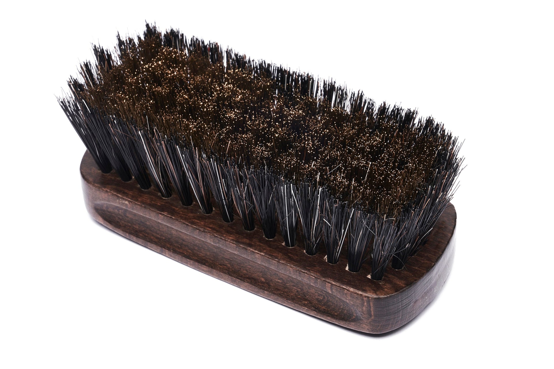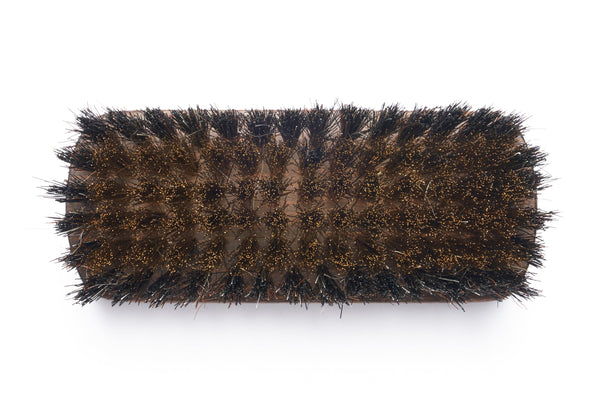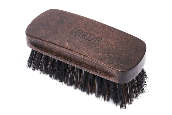 Spazzola in legno di faggio per pulizia della pelle scamosciata- Spazzola in legno di faggio mordenzato con manico ergonomico- Setole in ottone e crine di cavallo- 11,5 x 4,5 cm- Logo Lordh a caldo su manico-...